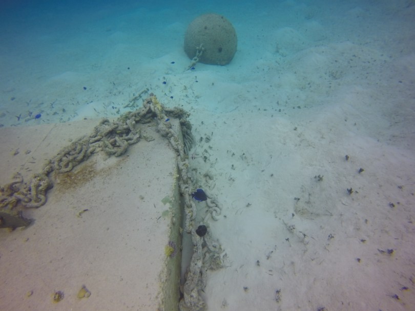 The enormous concrete block securing the enormous concrete ball securing our mooring buoy – I’m sure I could make a kids song out of this! February 3, 2015 960 × 720 Exuma Cays Land and Sea Park