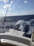 Over this first period the wave changed from big E sea to mixed rubbish, then to the W sea that I’d hoped for. The waves were steep and short. With the wind gusting 30+ knots at times it was exhilarating sailing but sometimes a bit too much. We got faster and faster as the waves built up and occasionally decided to take us with them. We also spoke to another yacht “That’s Life” who were heading to Puerto Rico and compared notes and strategies. With no planning or coordination at all, we were to stay in contact with them by VHF for the next 4 days. One of the crew, a long term immigrant to the US, was from Dunfermline. It’s a small world.