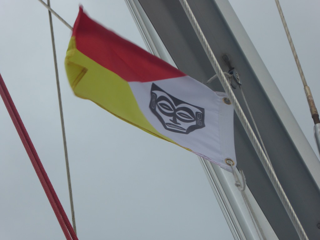 The official courtesy flag is French. We started with that then the Marquesas Island’s own. This is preferred by the locals. The only place I was able to find a small courtesy flag type within the Marquesas was at Nuka Hiva which we bought for 1000XFP. I think it would be an easy one to make up yourself if you had the time and inclination.