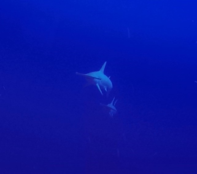 I also did a dive on the pass with the Taranga crowd. A little different to anywhere else I had been, you drop into the blue and descend to around 35m and hang 30-50m off the bottom, waiting to see what appears. We got a glimpse of a Great Hammerhead, solitary and huge, well below us on the floor and then were surprised when half a dozen Scallop Hammerhead appeared in full hunting order. When you can see the eye stalks you know they are a little close.