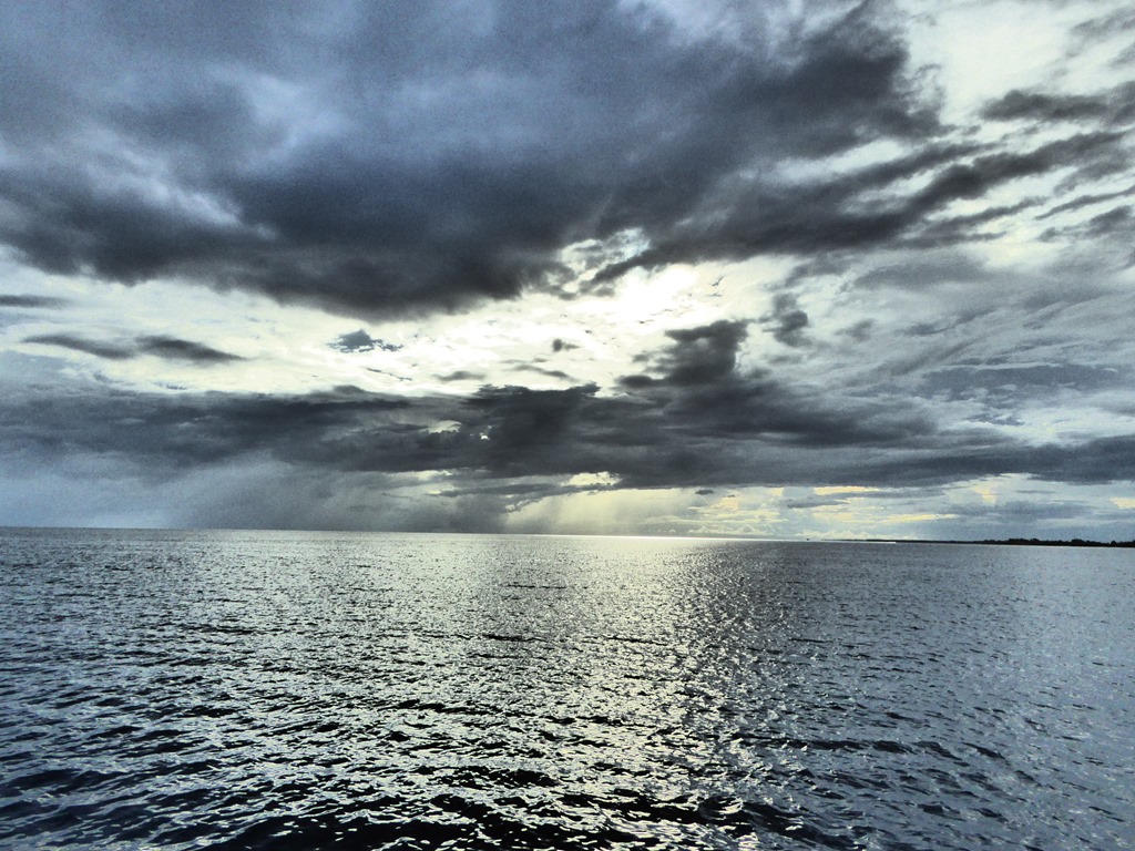 It was just as well that we did move. A couple of days into our stay we had a localised gale which roared in on us out of the W with no warning and nothing in the forecast. 30+ miles of fetch and 35+kts of wind gave us a short, very nasty sea and both Taranga and ourselves were thrown around  violently. Our dinghy, down but padlocked on, snapped its security cable and I was required to get the canoe down, quickly surf down to the dinghy and stop it before it hit shore. Not much fun at all in the dark but we were lucky we felt the cable snap and were able to save the dinghy and engine from being smashed up. The gale blew itself out by the morning but the weather wasn’t settled Trades. The sky, at times, could only be described as steel in colour.