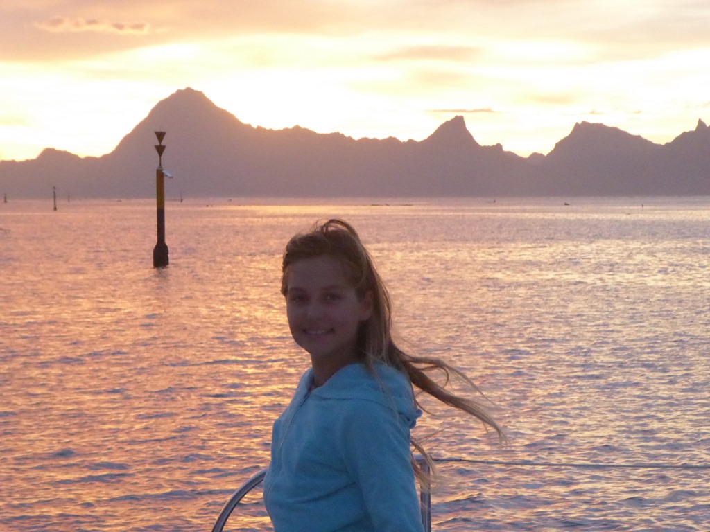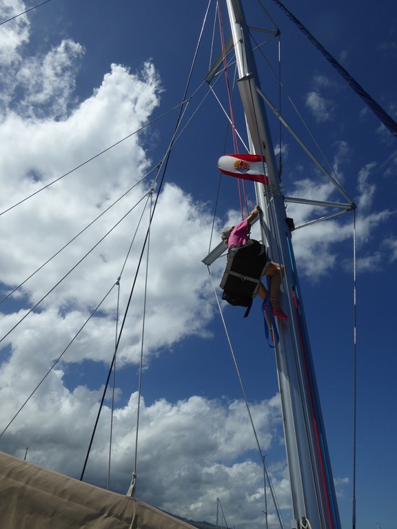 We feel into a routine quickly. I’d be up early to go to the local shop for bread. Breakfast would follow just after 0800hrs, there would be school for the girls, some bits and pieces for me to fix and then play in the afternoon. The girls were a great help as we rerigged the lazy jack system after our personal saviour, John stitched it up with his solid iron ancient sewing machine that just works a treat. Both kids went up the mast, one to take measurements for the new sails and one to take lines up. It was a great view from the top of the mast. The view across the reef to Moorea was fantastic.