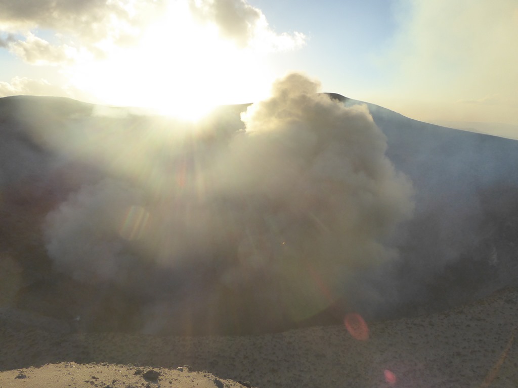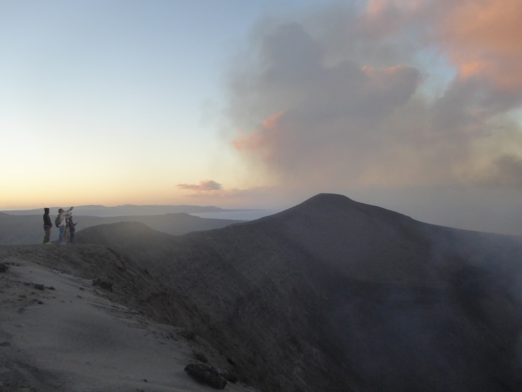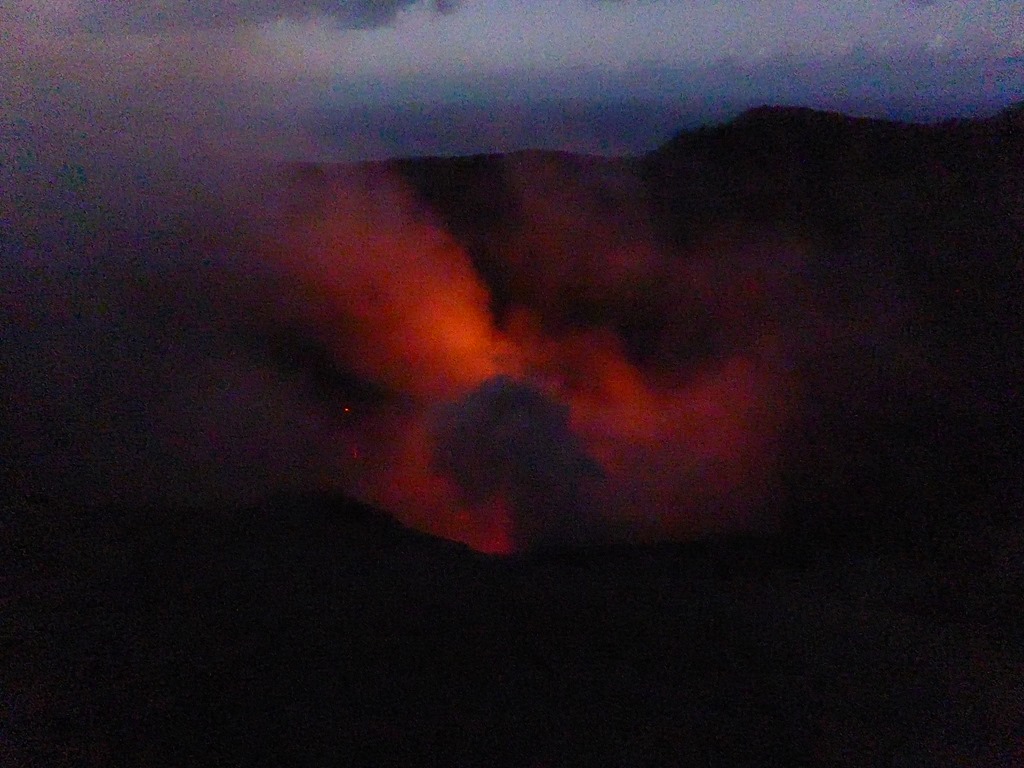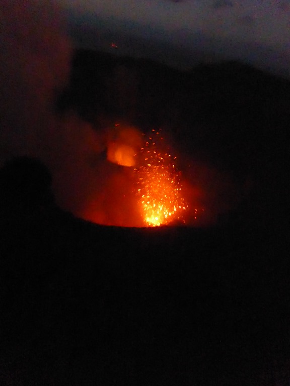 As the sun sets, what was impressive becomes extraordinary as the three different magma tubes feeding into the caldera become very evident. The power of the volcano (in a relative quiet mode) is belittling and you can understand why the locals thought that the volcano speaks with the voice of the Gods. The bangs are bloody noisy. The power of even a small eruption is scary.