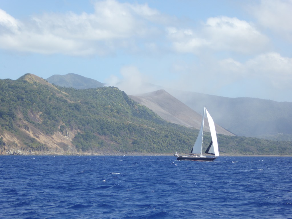 This was to be the last sail for Eleanor as she would be leaving the boat to return to the UK to start senior school. The wind was kind and we reached N overnight towards Efate, the main island of Vanuatu. Stop Work Order charged past us looking good with the volcano in the background.