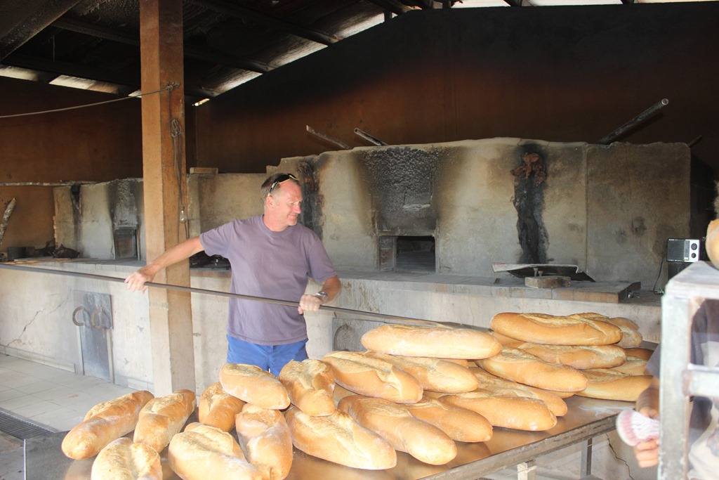 We had a good time in the village. My first task was to go and find fresh bread. After a joyous reunion with Kathi and Wolfi, one of our very favourite couples, it didn’t take long. We followed our noses through the village to the back door of a building. The traditional bread is a huge round which is then broken/cut into segments for sale. we arrived just in time to watch it being extracted from the oven. Baguettes were cooked in another kiln and the baker smiled, showed me how to extract them and handed me the pole. I had a great time and the baker seemed happy with my work. No discount was given on the couple of loaves I bought but I did get to choose my own. I went back the next day and helped out again. Simple pleasures!