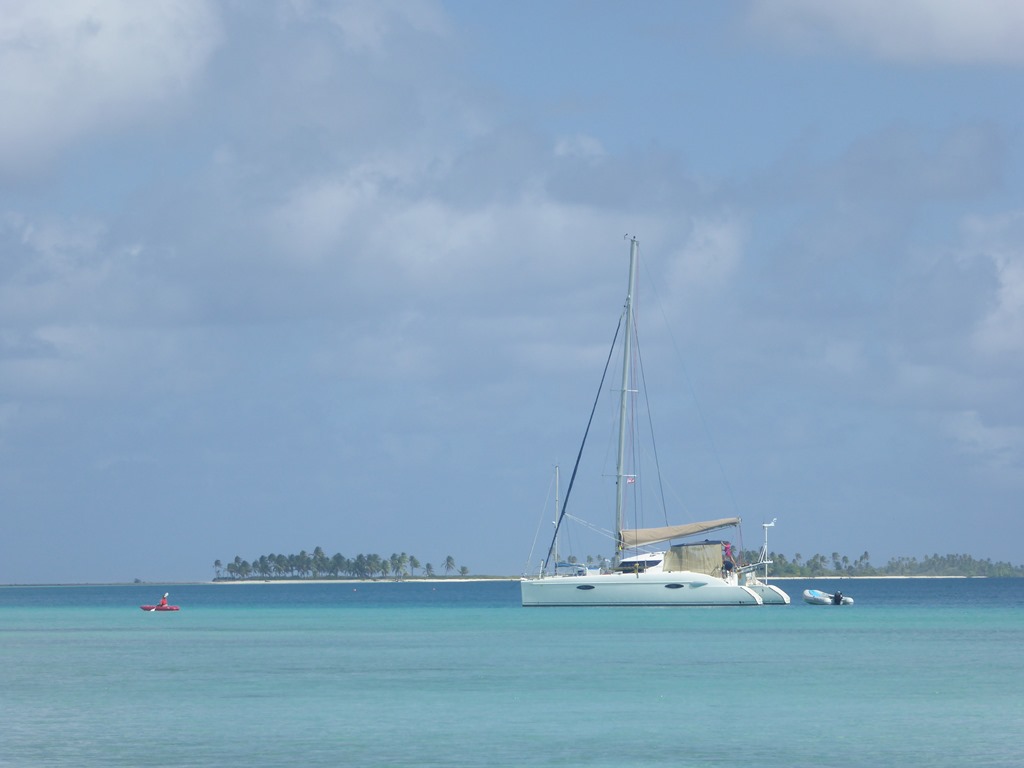 We had a pleasant two hour sail which went past one of the very few genuine islets to be found within an atoll. These days it is a pearl farm base and you need to be a little careful of the oyster strings that surround the it. Most of the floats are a few feet underwater so difficult to spot until you are nearly on top of them. Deeper keeled yachts might find it easier staying to its E as they move S. There are few strings between the islet and the atoll.