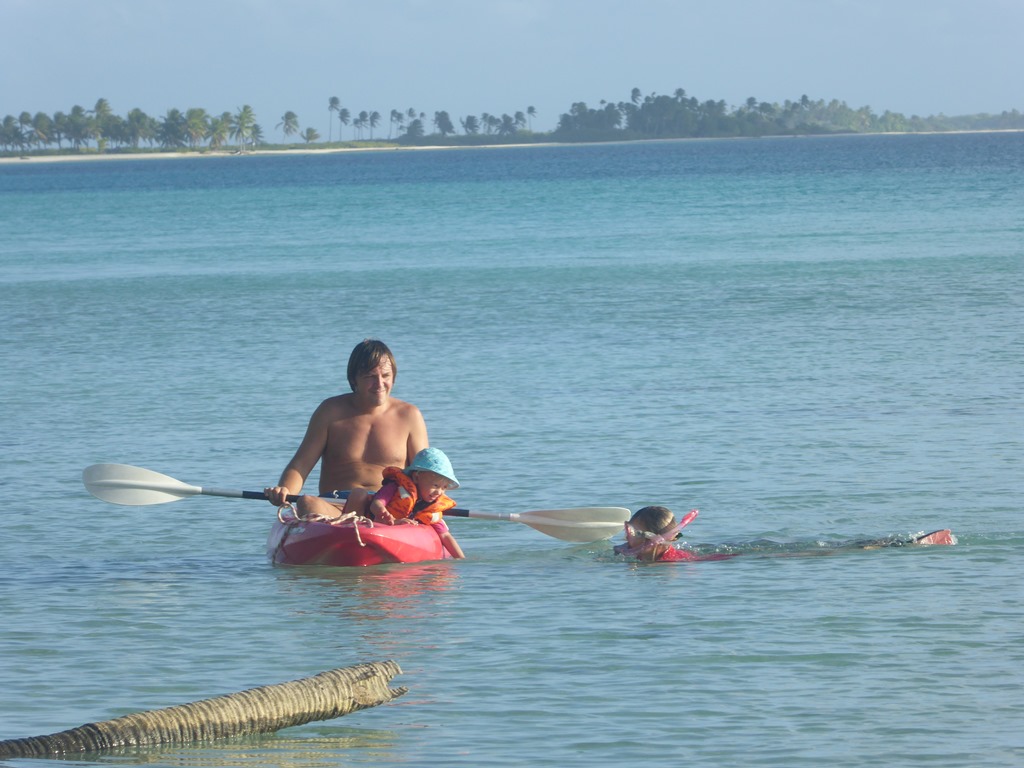 We had some great snorkelling just off the campsite with good coral in no more than 10’ of very clear water. There were good varieties of Angel, Butterfly and Damsel fish and we were always joined by black tip sharks. We came across another shallow coral site a mile to the E of us, three motu up, which was worth swimming on too. H also found out what happens when she puts on my weight belt. Bouncing between bottom and surface to breath and trying to giggle at the same time is not necessarily a good idea!