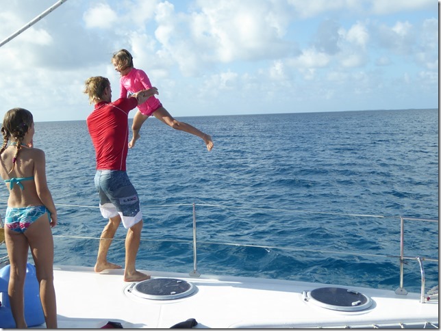 Our anchorage at 16 06.16S 142 22.70W is glorious and one of the most picturesque we have been in. Sadly the motu in front of us, with all the shelter provided by the coconut trees, has spiders (my ladies are wusses – imagine the squeals), mosquitoes and no-see-ums so it isn’t quite paradise but there is lots of shallow water which, when the weather permits, is wonderfully clear. The snorkelling is ok and we have been conducting swimming lessons – finally getting Hannah to do proper breaststroke, rather than her own particular version of it. For snorkelling, we have been exploring the bombies S of us. The list of new fish has been exciting Eleanor and the “Reef Fish Identification – Tropical Pacific” book by New World Publications has been getting a hammering. My favourite one so far is the wonderfully named Humbug Dascyllus – think of a clownfish but in black and white – although the 18” baby Peppered Moray Eel that panicked and tried to hide under my foot takes a close second! It is also been nice to have a resident team of Sharksuckers (similar to Remora but bigger) beneath the boat again, the first we have seen since the Bahamas.