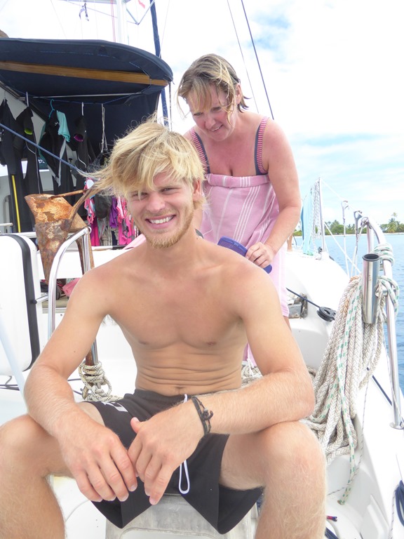 We also looked at how to ensure we protected the dinghy too. It isn’t as much as new procedures as absolutely enforcing the rules we used before. I have no wish for punctures so getting in the dinghy involves a sanitising of all coral sand from body and shoes before people are allowed in. The dinghy is always anchored off and not allowed to touch bottom. The engine is always lifted to protect the prop from coral lumps once we get to wading range of shore. We swim or wade ashore. I’m also very glad that I put 6’ of chain onto my dinghy anchor. I don’t think rope alone would last long. I wash out the dinghy daily to catch any last piece of sand we may have missed.